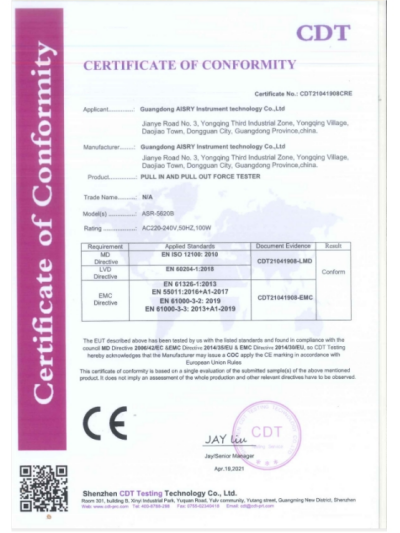 插拔力試驗機CE認證證書